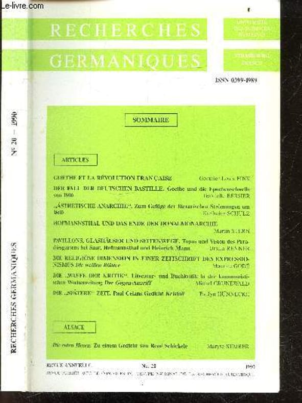Revue annuelle / SOMMAIRE : Goethe et la Révolution française par Gonthier-Louis Fink - Der Fall der deutschen Bastille. Goethe und die Epochenschwelle von 1806 par Gabrielle Bersier - Ästhetische Anarchie. Zum Gefüge der literarischen Strömungen um 1800 par Karlheinz Schulz- Hofmannsthal und das Ende der Donaumonarchie par Martin Stern- Pavillons, Glashäuser und Seitenwege Topos und Vision des Paradiesgartens bei Saar, Hofmannsthal und Heinrich Mann par Ursula Renner - Die religiöse Dimension in einer Zeitschrift des Expressionismus : Die weissen Blätter par Maurice Godé - Die Waffe der Kritik. Literatur- und Buchkritik in der kommunistischen Wochenzeitung ,Der Gegen-Angriff par Michel Grunewald - Die spätere Zeit. Paul Celans Gedicht Kristall par Evelyn Hünnecke - Alsace : Die roten Hosen. Zu einem Gedicht von René Schickele par Maryse Staiber Classification Dewey : 70.49-Presse illustrée, magazines, revues