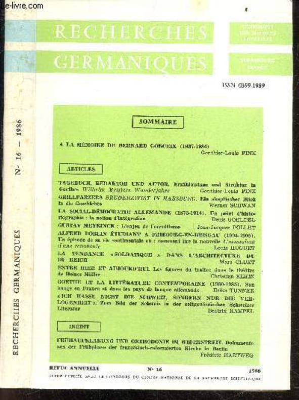 Revue annuelle / SOMMAIRE : Tagebuch, Redaktor und Autor. Erzählinstanz und Struktur in Goethes Wilhelm Meisters Wanderjahre par Gonthier-Louis Fink- Grillparzers Bruderzwist in Habsburg. Ein skeptischer Blick in die Geschichte par Werner Schwan- La social-démocratie allemande (1875-1914). Un point d’historiographie : la notion d’intégration par Denis Goeldel- Gustav Meyrinck : L’enjeu de l’occultisme par Jean-Jacques Pollet- Alfred Döblin étudiant à Fribourg-en-Brisgau (1904-1905). Un épisode de sa vie sentimentale ou : comment lire la nouvelle L’assassinat d’une renoncule par Louis Huguet- La tendance « soldatique » dans l’architecture du Troisième Reich par Marc Cluet- Entre hier et aujourd’hui. Les figures du traître dans le théâtre de Heiner Müller par Christian Klein- Goethe et la littérature contemporaine (1960-1985). Son image en France et dans les pays de langue allemande par Erika Tunner- « Ich hasse nicht die Schweiz, sondern nur die Verlogenheit ». Zum Bild der Schweiz in der zeitgenössischen schweizer Literatur par Beatrix Kampel- Frühaufklärung und Orthodoxie im Widerstreit. Dokumente aus der Frühphase der französisch-reformierten Kirche in Berlin par Frédéric Hartweg Classification Dewey : 70.49-Presse illustrée, magazines, revues