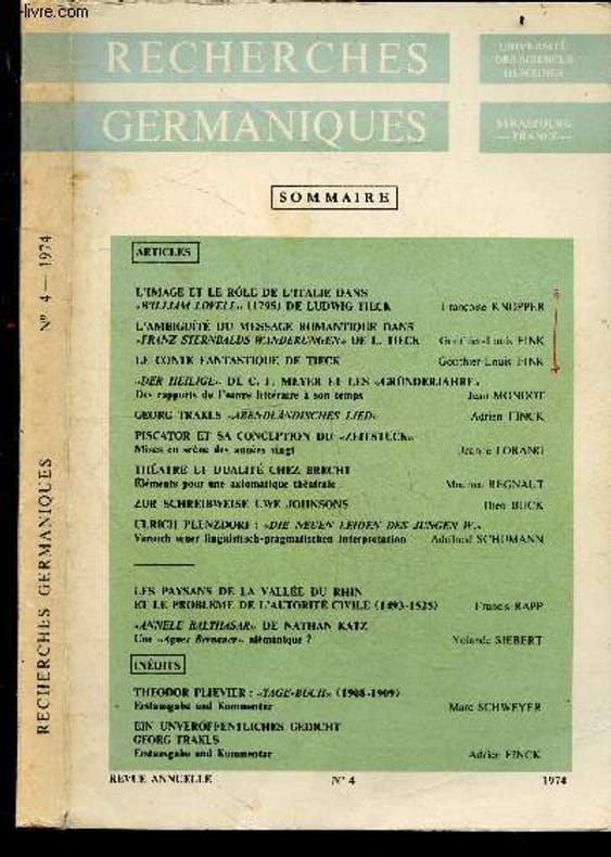 Revue annuelle / SOMMAIRE : L’image et le rôle de l’Italie dans William Lovell (1795) de Ludwig Tieck par Françoise Knopper- L’ambiguïté du message romantique dans Franz Sternbalds Wanderungen de L. Tieck par Gonthier-Louis Fink- Le conte fantastique de Tieck par G-L Fink- Der Heilige de C. F. Meyer et les Gründerjahre. Des rapports de l’oeuvre littéraire à son temps par Jean Mondot- Georg Trakls Abendländisches Lied par Adrien Finck- Piscator et sa conception du Zeitstück. Mises en scène des années vingt par Jeanne Lorang- Théâtre et dualité chez Brecht. Éléments pour une axiomatique théâtrale par Maurice Regnaut- Zur Schreibweise Uwe Johnsons par Théo Buck- Ulrich Plenzdorf : Die neuen Leiden des jungen W. Versuch einer linguistisch-pragmatischen Interpretation par Adelheid Schumann- Les paysans de la Vallée du Rhin et le problème de l’autorité civile (1493-1525) par Francis Rapp- Annele Balthasar de Nathan Katz. Une Agnes Bernauer alémanique ? par Yolande Siebert- Theodor Plievier : Tage-Buch (1908-1909). Erstausgabe und Kommentar par Marc Schweyer- Ein unveröffentlichtes Gedicht Georg Trakls. Erstausgabe und Kommentar par Adrien Finck Classification Dewey : 70.49-Presse illustrée, magazines, revues