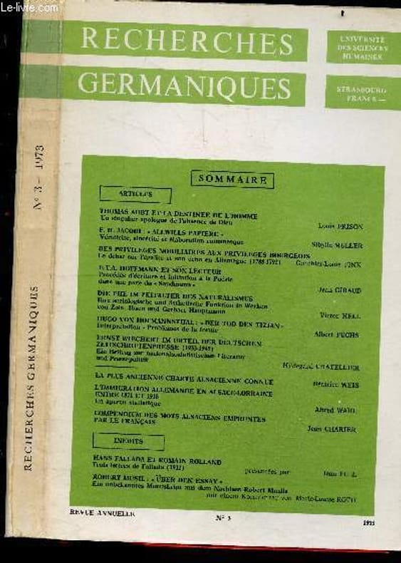 Revue annuelle / SOMMAIRE : Thomas Abbt et la destinée de l’homme. Un singulier apologue de l'absence de Dieu par Louis Frison- F. H. Jacobi : Allwills Papiere. Véridicité, sincérité et élaboration romanesque par Sibylle Muller- Des privilèges nobiliaires aux privilèges bourgeois. Le débat sur l’égalité et son écho en Allemagne (1788-1792) par Gonthier-Louis Fink- E.T.A. Hoffmann et son lecteur. Procédés d’écriture et initiation à la Poésie dans une page du Sandmann parJean Giraud- Die Ehe im Zeitalter des Naturalismus. Ihre soziologische und ästhetische Funktion in Werken von Zola, Ibsen und Gerhart Hauptmann par Victor Hell- Hugo von Hofmannsthal : Der Tod des Tizian. Interprétation - Problèmes de la forme par Albert Fuchs- Ernst Wiechert im Urteil der deutschen Zeitschriftenpresse (1933-1945). Ein Beitrag zur nationalsozialistischen Literatur- und Pressepolitik par Hildegard Chatellier-La plus ancienne charte alsacienne connue par Béatrice Weis- L’immigration allemande en Alsace-Lorraine entre 1871 et 1918. Un aperçu statistique par Alfred Wahl- Compendium des mots alsaciens empruntés par le français par Jean Charier- Hans Fallada et Romain Rolland. Trois lettres inédites de Fallada (1912) par Jean Full- Auteur/Autrice mentionné(e) dans une citation ou des extraits de textes : Hans Fallada sem-link Romain RollandRobert Musil : uber den essay, ein unbekanntes manuskript aus dem nachlass robert musils mi einem kommentar von Marie Louise Roth Classification Dewey : 70.49-Presse illustrée, magazines, revues