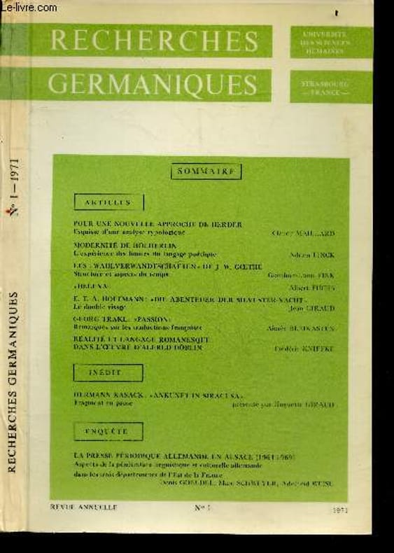 Revue annuelle / SOMMAIRE : Pour une nouvelle approche de Herder. Esquisse d’une analyse typologique par Claude Maillard - Modernité de Hölderlin. L’expérience des limites du langage poétique par Adrien Finck- Les Wahlverwandtschaften de J. W. Goethe. Structure et aspects du temps par Gonthier-Louis Fink- Helena par Albert Fuchs- E. T. A. Hoffmann : Die Abenteuer der Silvester-Nacht. Le double visage par Jean Giraud- Georg Trakl : Passion. Remarques sur les traductions françaises par Aimée Bleikasten- Réalité et langage romanesque dans l’œuvre d’Alfred Döblin par Frédéric Kniffke- Hermann Kasack : Ankunft in Siracusa. Fragment en prose par Huguette Giraud-Auteur/Autrice mentionné(e) dans une citation ou des extraits de textes : Hermann Kasack - Enquête : La presse périodique allemande en Alsace (1964-1969). Aspects de la pénétration linguistique et culturelle allemande dans les trois départements de l’Est de la France par Denis Goeldel & Marc Schweyer & Adelheid Weise Classification Dewey : 70.49-Presse illustrée, magazines, revues