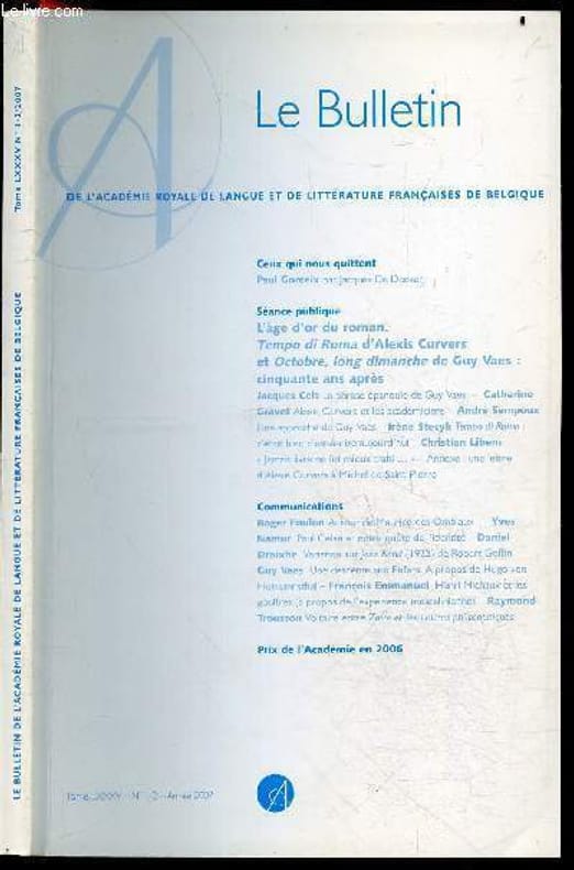 SOMMAIRE : Ceux qui nous quittent : Paul Gorceix par Jacques De Decker- Seance publique: L'age d'or du roman/ Tempo di roma d'alexis Curvers et Octobre, long dimanche de Guy Vaes: cinquante ans apres- La phrase epanouie ed Guy Vaes par Jacqyes Cels- Alexis Curvers et les academies par Catherine Gravet- Une apporche de Guy Vaes par André Sempoux- Tempo di roma: c'etait hier, c'est a dire aujourd'hui par Irene Stecyk- Jamais livre ne fut mieux trahit par Chistian Libens - annexe: une lettre d'Alexis Curvers a Michel de Saint-Pierre- Communications: Autour de Maurice des Ombiaux par Roger Foulon- Paul Celan et notre quete de l'identite par Yves Namur- Variation sur Jazz Band de robert Goffin par Daniel Droixhe- Une descente aux enfers, a propos de hugo von hofmannsthal par guy vaes- Henri michaux et les gouffres (a propos de l'experience mescalinienne) par Francois Emmanuel- Voltaire entre zaire et les lettres philosophiques par Raymond Trousson - Prix de l'academie en 2006 Classification Dewey : 70.49-Presse illustrée, magazines, revues
