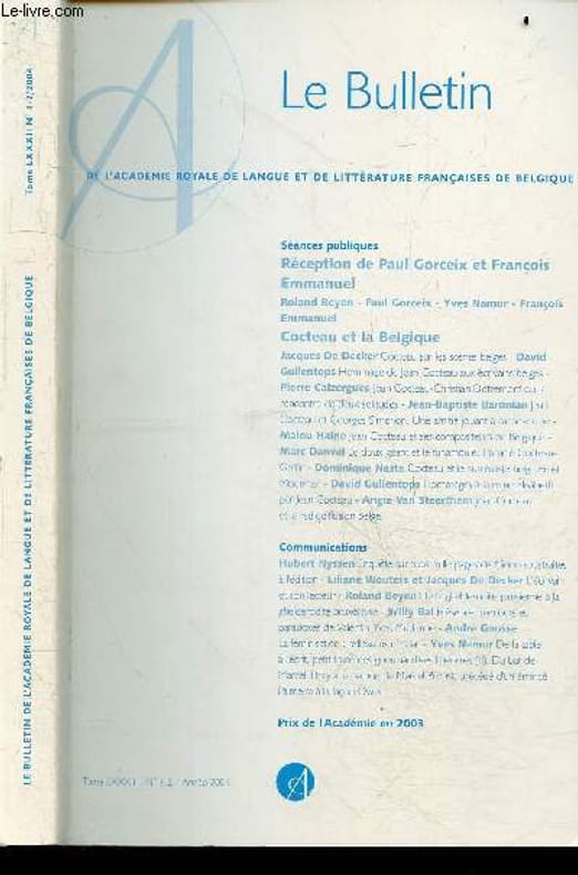 SOMMAIRE : Reception de Paul Gorceix et Francois Emmanuel par roland beyen, paul gorceix, yves namur, francois emmanuel - Cocteau et la Belgique : cocteau sur les scenes belges par jacques de decker, hommage de Jean cocteau aux ecrivains belges par david gullentops, Cocteau/Christian Dotremeont ou la rencontre de deux solitudes par pierre caizergues, Cocteau / Simenon une amitie jouant a cache cache par jean-baptiste baronian, Cocteau & ses compositeurs en Belgique par malou haine, Le doux geant et le funambule : L'amitie cocteau/ Goffin par marc danval , Cocteau et le surrealiste blege Ernst Moerman par dominique nasta, Hommages a la reine Elisabeth par Cocteau, Cocteau et la radiodiffusion belge par Angie Van Steerthem- Communications: Enquete sur trois mille pages de Giono soustraites a l'edition par Hubert Nyssen, L'ecrivain et son lecteur par Liliane Wouters & Jacques de Decker- De la ghelderodite parisienne a la ghelderodite bruxelloise par Roland Beyen- Presence, parcours et paradoxes de Valentin Yves Mudimbe par Willy Bal- La feminisation: reflexions et bilan par Andre Goosse- De la table a l'ecrit, petit traite des gourmandises litteraires (II), du bar de Marcel Thiry a la barbue de Marcel Proust, precede d'un emince palmeira a la facon Owen par Yves Namur- Prix de l'academie en 2003 Classification Dewey : 70.49-Presse illustrée, magazines, revues