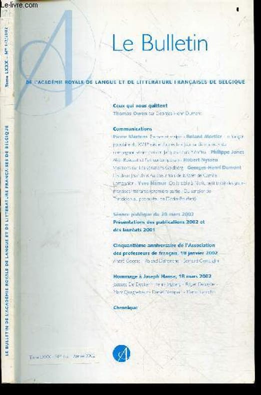 "SOMMAIRE : Ceux qui nous quittent: Thomas Owen par Georges-Henri Dumont- Plumes et Scalpel par Pierre Mertens- Le francais populaire du XVIIIe siecle d'apres ""le journal de ma vie"" du compagnon vitrier parisien Jacques-Louis Menetra par Roland Mortier, Alain Bosquet & l'art contemporain par Philippe Jones, Variations sur Les variations Goldberg par Hubert Nyssen, Les deux Jeans dans Au coeur frais de la foret de Camille Lemonnier par Georges-Henri Dumont, De la table a l'ecrit: petit traite des gourmandises litteraires (1ere part, du sanglier de trimalcion au pot au feu de dodin-bouffant) par Yves Namur- Presentations des publications 2002 & des laureats 2001- 50e anniversaire de l'association des professeurs francais, 18 janvier 2002 par andre goosse, roland delronche, bernard cerquiglini- Hommage a Joseph Hanse, 18 mars 2002 par Jacques de Decker, Henry Ingberg, Roger Dehaybe, Marc Quaghebeur, Daniel Blampain, Daniel Laroche- Chronique Classification Dewey : 70.49-Presse illustrée, magazines, revues"
