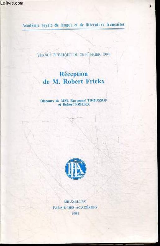 Academie Royale de Langue et de Litterature francaises. 1994. In-8. Broché. Etat d'usage, Couv. convenable, Dos satisfaisant, Intérieur frais. Paginé de 5 à 26 - Avec envoi de Robert Frickx, à l'attention de Paul et Andrée Gorceix, sur la 1ere page de lecture, voir 2e photo. . . . Classification Dewey : 97.2-Dédicace, envoi