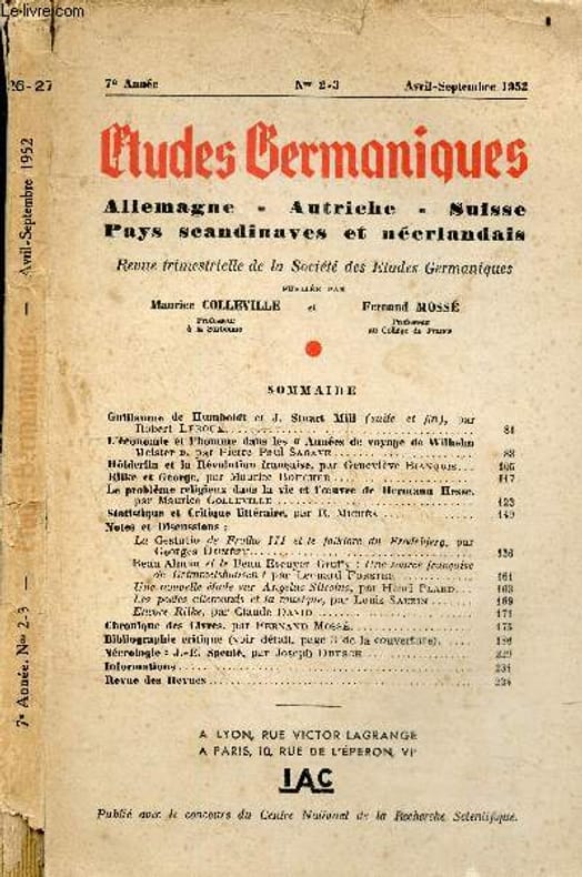 Revue trimestrielle/ allemagne, autriche, suisse, pays scandinaves et neerlandais / SOMMAIRE : Guillaume de Humboldt & J. Stuart Mill (suite & fin) par Robert Leroux- L'économie & l'homme dans les Années de voyage de Wilhelm Meister par Pierre-Paul Sagave- Hölderlin & la Révolution française par Geneviève Bianquis- Rilke & George par Maurice Boucher- Le problème religieux dans la vie & l'oeuvre de Hermann Hesse par Maurice Colleville- Statistique & Critique littéraire par R. Michéa- Notes & discussions: La gestatio de Frotho III et le folklore du frodebjerg par Georges Dumezil/ Beau Alman et le Beau Escuyer Gruffy : une source francaise de Grimmelshausen ? par Leonard Forster/ Une nouvelle etude sur Angelus Silesius par Henri Plard/ Les poetes allemands et la musique par Louis Sauzin/ Encore rilike par Claude David- Chronique des livres par Fernand Mossé- Nécrologie: J-E. Spenlé par Joseph Dresch ... Classification Dewey : 70.49-Presse illustrée, magazines, revues