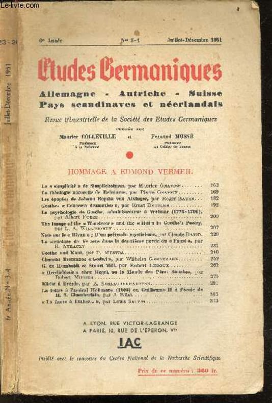 Société des Etudes Germaniques / IAC. 1951. In-8. Broché. Etat d'usage, Couv. légèrement passée, Coiffe en pied abîmée, Quelques rousseurs. Paginé de 161 à 320 - Une planche illustrée d'un portrait photo noir/blanc de Edmond Vermeil en frontispice - En francais, anglais & allemand- Rousseurs sur la couverture - Une partie des pages est non coupée - Dos & coins frottés. . . . Classification Dewey : 70.49-Presse illustrée, magazines, revues