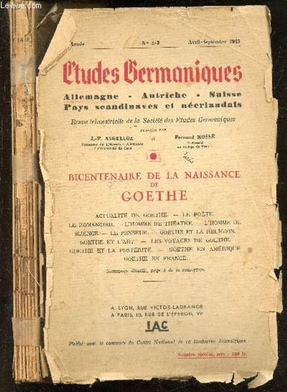 Société des Etudes Germaniques / IAC. 1949. In-8. Broché. Etat passable, Plats abîmés, Dos abîmé, Quelques rousseurs. Paginé de 97 à 342 - en francais et en allemand - Dos manquant/ abimé / fané, réparé avec trois bandes d'adhésif - 1er plat volant, ainsi que quelques pages publicitaires en fin d'ouvrage - 2e plat manquant - Quelques annotations sans conséquence sur la lecture. . . . Classification Dewey : 70.49-Presse illustrée, magazines, revues
