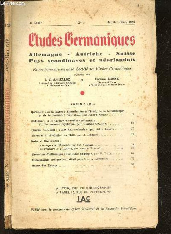 Société des Etudes Germaniques / IAC. 1949. In-8. Broché. Etat d'usage, Couv. légèrement passée, Dos frotté, Quelques rousseurs. Paginé de 1 à 96 - Rousseurs sur la couverture - 2e plat manquant. . . . Classification Dewey : 70.49-Presse illustrée, magazines, revues