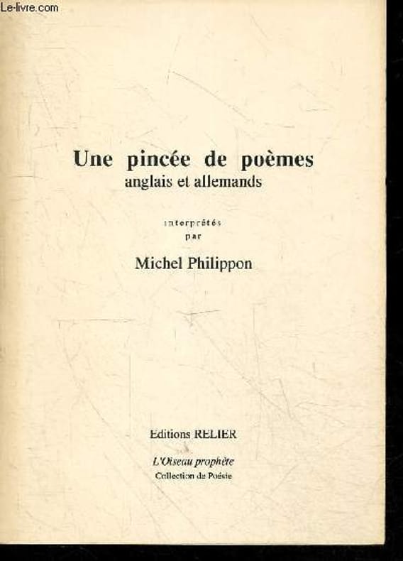 RELIER. 1995. In-8. Broché. Etat d'usage, Couv. convenable, Dos satisfaisant, Intérieur frais. Environ 45 PAGES - Avec envoi de l'auteur, à l'attention de Paul Gorceix, germaniste francais, voir 2e photo (en page de faux titre) - Poemes en francais, et leur traduction en regard soit en anglais, soit en allemand - Rousseurs sur la couverture. . . . Classification Dewey : 97.2-Dédicace, envoi