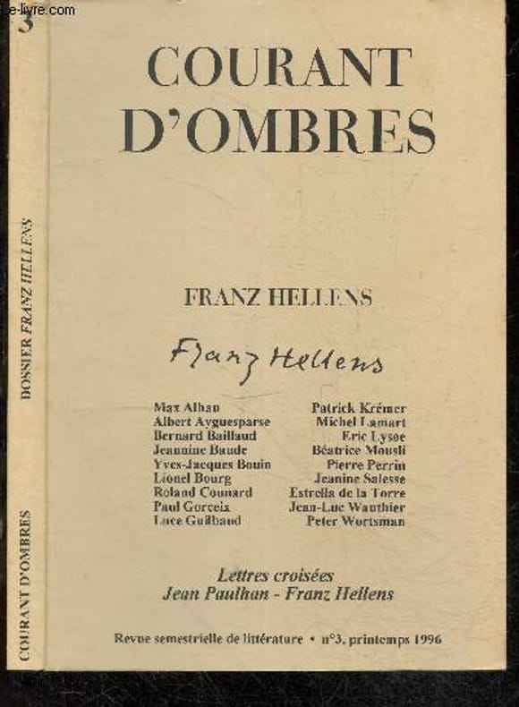 Courant d'Ombres n°3, printemps 1996- Franz Hellens - Lettres croisees Jean Paulhan / Franz Hellens par Bernard Baillaud - Approche d'une oeuvre: Albert Ayguesparse- Mystique & ecriture du fantastique: Paul Gorceix, L'irreparable faute de l'ecriture: Patrick Kremer, Accueil de l'oeuvvre en espagne: Estrella de la Torre, L'itineraire ambigu d'Elseneur: Jean-Luc Wauthier, Melusine & le futurisme: Eric Lysoe, Rever une revue: Jeannine Baude, Pour une revue europeenne: Beatrice Mousli, Nonante ans / nonante titres: itineraire, Pages de creation: Michel Lamart: le papier peint, Pierre Perrin: Tombeau, Jeanine Salesse: Le pain de pierre, Luce Guilbaud: partage du couchant, Yves-Jacques Bouin: place, Max Alhau: franchir le seuil- Babel : Peter Wortsman: le jeu de la mort- Lettre de Wallonie de Roland Counard, Lettre de New-York de Peter Worstman - Notes de lecture - Livre a venir : Matiere du temps de Lionel Bourg ... Classification Dewey : 70.49-Presse illustrée, magazines, revues