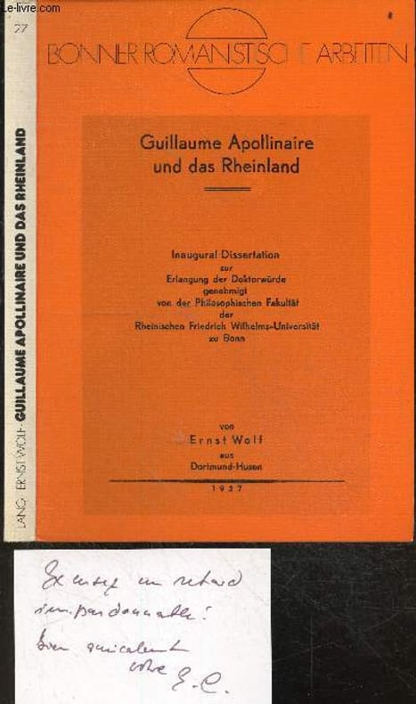 Guillaume Apollinaire und das Rheinland - Inaugural dissertation zur erlangung der doktorwurde genehmigt von der philosophischen fakultat der rheinischen friedrich wilhelms-universitat zu Bonn- Bonner Romanistische arbeiten, Band 27 - Herausgegeben von Eberhard Leube Classification Dewey : 97.2-Dédicace, envoi