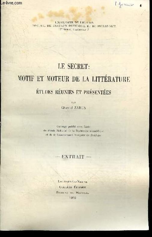 "COLLEGE ERASME, BUREAU DU RECUEIL, LOUVAIN LA NEUVE/ - Universite de Louvain, recueil de travaux d'histoire et de philologie, 7e serie, fascicule 7. 1999. In-8. Broché. Etat d'usage, Tâchée, Dos satisfaisant, Quelques rousseurs. Paginé de 73 à 95 - Avec Envoi de l'auteur sur un papier volant avec en tête "" Fachbereich fremdsprachliche philologien institut fur romanische philologie der philipps universitat marburg"", à l'attention de Paul Gorceix, germaniste francais (voir 2e photo) - Rousseur et annotation (""P. Gorceix"") sur le 1er plat - Ouvrage légèrement gondolant. . . . Classification Dewey : 97.2-Dédicace, envoi"