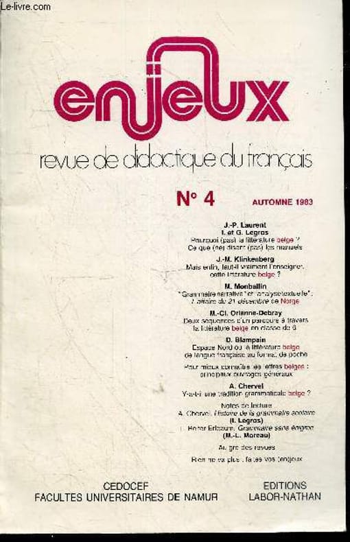"Enjeux n°4 automne 1983, revue de didactique du francais- Pourquoi (pas) la litterature belge? ce que (ne) disent (pas) les manuels par JP Laurent & I. et G. Legros - Mais enfin, faut il vraiment l'enseigner cette litterature belge ? par JM Klinkenberg - ""Grammaire narrative"" & ""analyse textuelle"": l'affaire du 21 decembre de Norge par M. Monballin - 2 sequences d'un parcours a travers la litterature belge en classe de 6e par M-CL Orianne-Debray - Espace nord ou la litterature belge de langue francaise au format de poche / Pour mieux connaitre les lettres belges : principaux ouvrages generaux par D. Blampain - Y a t il une tradition grammaticale belge ? par A. Chervel - Notes de lecture: A. Chervel, histoire de la grammaire scolaire (I. Legros) / L. Reiter Erlbaum, grammaire sans enigme (ML Moreau) - Au gre des revues - Rien ne va plus : faites vos (en)jeux Classification Dewey : 70.49-Presse illustrée, magazines, revues"