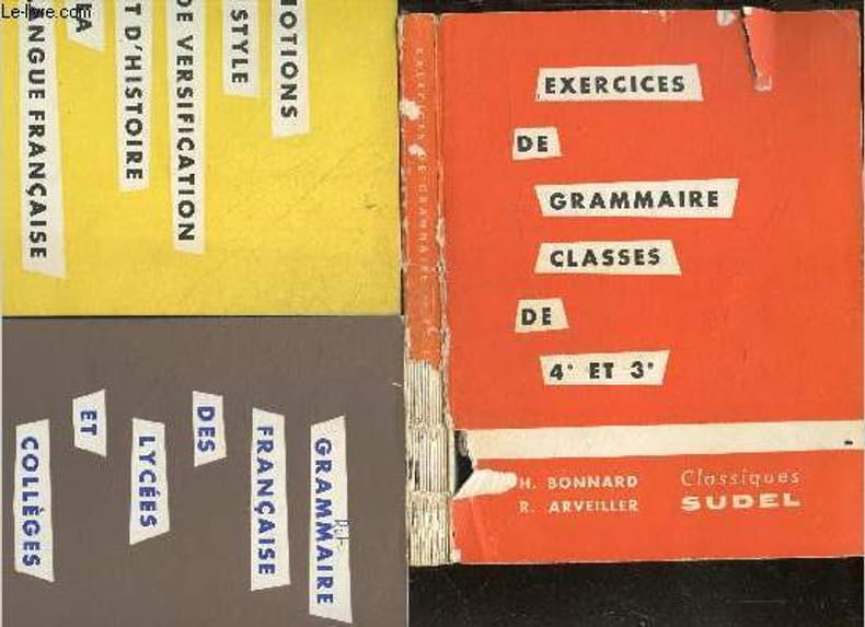 "SUDEL CLASSIQUES. 1963-1966. In-8. Broché. Etat d'usage, Couv. légèrement passée, Dos satisfaisant, Quelques rousseurs. 279 + 175 + 382 PAGES - ""Exercices de grammaire classes de 4e et 3e"" : Couverture abîmée, gros manque au dos/ dos fané, petites déchirures sur le 1er plat + quelques annotations et tampons sans conséquence sur la lecture - ""Notions de style de versification et d'histoire de la langue francaise"" : manque en coiffe de pied / dos légèrement frotté - ""Grammaire francaise des lycees et colletges"" : quelques figures en noir/blanc dans le texte, petite annotation sur le 1er plat. . . . Classification Dewey : 372.6-Livre scolaire : français"