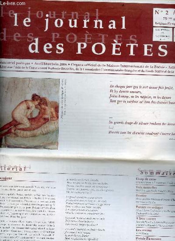 Trimestriel poetique - organe officiel de la Maison Internationale de la Poesie Arthur Haulot, edite avec l'aide de la communaute wallonie-bruxelles, de la commission communautaire francaise et du fonds national de la litterature // SOMMAIRE : Deux poetes ecossais d'aujourd'hui par Francis Edeline- Voix nouvelles : paul eric letellier/ bertrand de witte- La poesie latine & l'amour par claude raynaud- Poesie panorama par Leuckx philippe- Paroles en archipel : muir/ alonso/ cushman/ tierra/ brugnaro/ bocholier/ loubes/ abel - ... Classification Dewey : 70-Journalisme, édition. Journaux