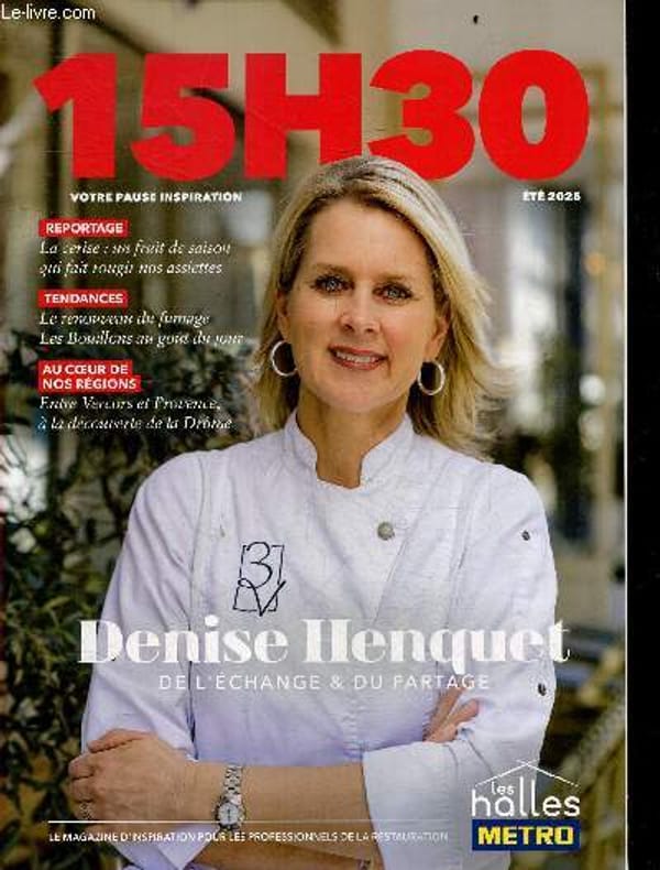 15H30 Votre pause inspiration- été 2025 - Denise Henquet de l'echange & du partage- Reportage: La cerise un fruit de saison qui fait rougir nos assiettes- Le renouveau du fumage- Les bouillons au gout du jour- Entre vercors & provence a la decouverte de la drome- le bar par olivier & morgan gremillet- oceane x METRO- un guide pour financer votre restaurant- chez privé de dessert, l'illusion s'invite a la table- dish pay now le paiement tout simple- pour ou contre les cartes sans prix pour les invites- la trancheuse manuelle a volant .... Classification Dewey : 70.49-Presse illustrée, magazines, revues