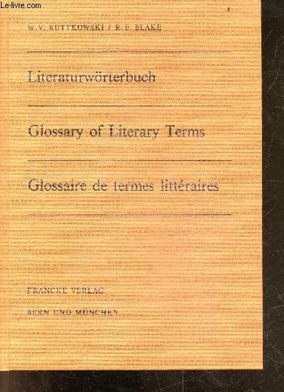 Glossaire des termes litteraires, en francais, allemand et anglais, avec racines grecques et latines, pour l'etudiant de litterature generale et de litterature comparee / Literaturworterbuch , In deutsch, englisch und franzosisch mit griechischen und lateinischen ableitungen fur den studenten der allgemeinen und vergleichenden literaturwissenschaft / Glossary of literary terms, in english, german and french, with greek and latin derivations of terms for the student of general and comparative literature Classification Dewey : 410-Linguistique