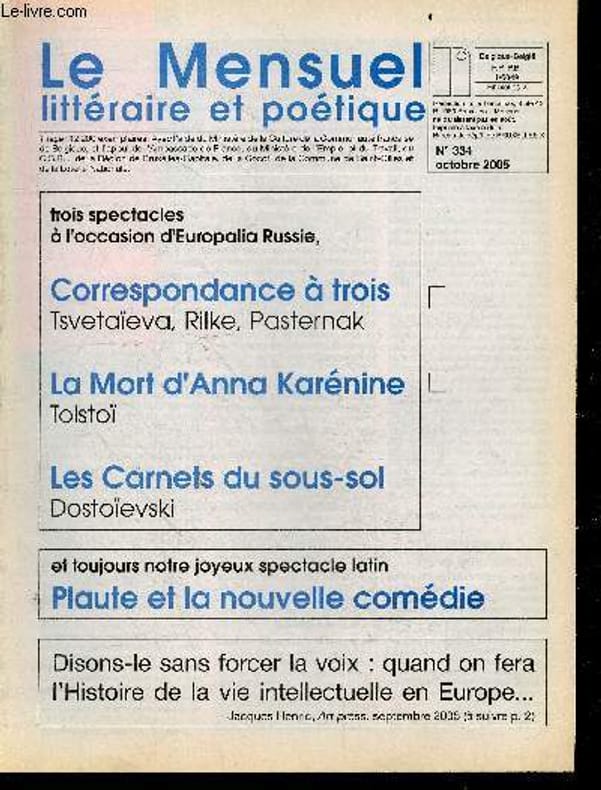 SOMMAIRE: europalia russie : 3 spectacles : correspondance a 3 tsvetaieva, rilke, pasternak + la mort d'anna karenine tolstoi + les carnets du sous sol dostoievski - Spectacle latin: plaute et la nouvelle comedie- Quand on fera l'histoire de la vie intellectuelle en europe- ecriture et memoire: claude vigee, le juste aimer de charles dobzynski, monique lise cohen et le desir d'ecriture- le reel / le symbolique & l'imaginaire : helene sanguinetti, valeriecatherine richez, jean louis giovannoni- polars et autres quetes : gerard le gouic, michael marshall smith, patricia gotlib, jean paul michallet- l'experience poetique : michel jourdan, jean mambrino... Classification Dewey : 70.49-Presse illustrée, magazines, revues