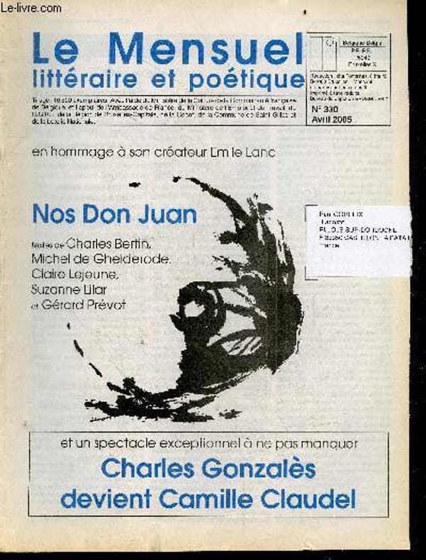 SOMMAIRE: En hommage a son createur emile lanc, nos Don Juan : textes de charles bertin, michel de ghelderode, claire lejeune, suzanne lilar & gerard prevot- Spectacle: charles gonzales devient camille claudel- Entretiens: francois claudel, nathalie gassel, yves nilly, serge lesourd, caroline lamarche, jacques garelli, dany robert dufour, michel deguy, frederic sojcher...- Litterature: gerard clery, pierre dhainaut, alain freixe, pol vandromme, andre velter, sophie loizeau, barry eisler, dominique noguez, philippe jones, alain bosquet de thoran, yves broussard, jean paul de dadelsen... Classification Dewey : 70.49-Presse illustrée, magazines, revues