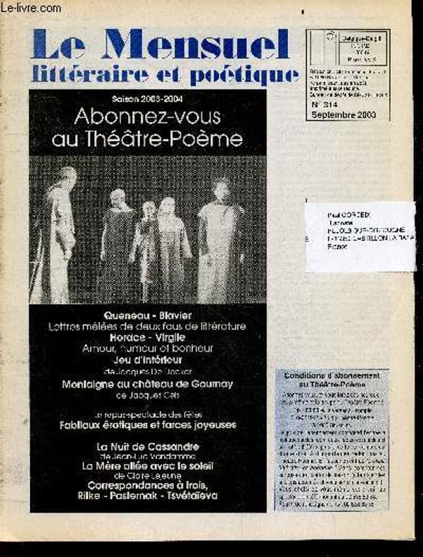 SOMMAIRE: Saison 2003-2004 theatre poeme- Queneau blavier, lettres melees de deux fous de litterature- Horace Virgile amour, humour et bonheur- Jeu d'interieur de jacques de decker- Montaigne au chateau de gournay de jacques cels- repas spectacle des fetes: fabliaux eotiques et farces joyeuses- La nuit de cassandre de jean luc vandamme- La mere allee sous le soleil de claire lejeune- Correspondance a trois, rilke, pasternak, tsvetaieva- Litterature: marc blanchet, francois bott, edouard glissant, eugenio lopez, mrs riddell, helene sanguinetti, patrick wald lasowski, alain jouffroy- Entretiens: veronique bergen, frederick tristan, a la memoire de salvadore allende, unimuse ... Classification Dewey : 70.49-Presse illustrée, magazines, revues