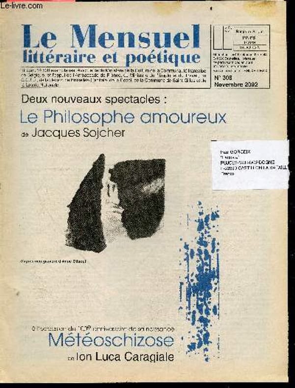 SOMMAIRE: Spectacles: Le philosophe amoureux de jacques sojcher / Meteoschizose de Ion Luca Caragiale, pour le 100e anniversaire de sa naissance- Entretiens: carl andré, michel azama, joel baqué, fethi benslama, olivier brun, michel dewez, nelly kaplan, charles melman, maurice nadeau, jose luis peixoto, frederic sojcher, frederic schiffer, le seminaire de psychanalyse - Spectacles: les faits et les dits de molinet ... Classification Dewey : 70.49-Presse illustrée, magazines, revues