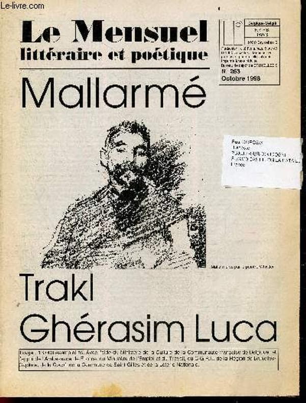 SOMMAIRE: Mallarmé - trakl - gherasim luca- femmes belges de marcel moreau- antonio lobo antunes l'invention du monde- dans la proximite de hart crane / kijno & quelques compagnons de route- gerard titus carmel, salah stetie, paul colinet, yves leclair, liliane atlan, jean bensimon, franz rosenzweig, jean luc benoziglio, ... Arts: jephan de villiers, picabia, le bernin- Entretiens: michele goslar, teresa rita lopez, eric clemens, claude henri rocquet, albert jacquard, alain didier-weill ... - Spectacles: mallarmé et la belgique/ trakl ou la fureur d'etre/ l'inventeur de l'amour / savantissimi doctores... Classification Dewey : 70.49-Presse illustrée, magazines, revues