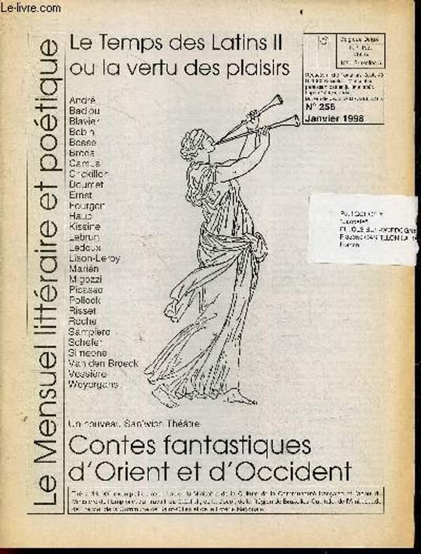 SOMMAIRE: Le temps des latins II ou la vertu des plaisirs - San'wich theatre : Contes fantastiques d'orient et d'occident- martine broda, carlo ginzburg, bernard simeone, jacqueline risset, michel vessiere, alain badiou, francois weyergans, marianne van den broeck, christian bobin, marcel migozzi, andre blavier, marcel marien, maurice roche, jacques crickillon, jean jacques rousseau- Art: mac ernst, pollock et un enlumineur / picasso, gaston bertrand, rousseau- Entretiens: gerard adam, vincent magos, jean louis schefet, lectures en pas de deux, ... Classification Dewey : 70.49-Presse illustrée, magazines, revues