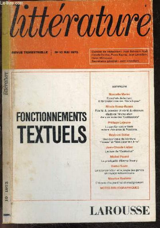 "Ricochets de lecture, la fantasmatique des ""diaboliques"" par Marcelle Marini - Realite du souvenir et verite du discours, etude de l'enonciation dans un texdte des ""confessions"" par Nicole Kress-Rosen - La punition des enfants, lecture d'un aveu de rousseau par Philippe Lejeune - Une economie de l'ecrituren ""fusees"" & ""mon coeur mis a nu"" de Beatrice Didier - Lecture de ""quelqu'un"" par Jean-Claude Lieber - La prodigalite d'emma bovary par Michel Picard - La science fiction & la jungle des genres, un voyage extraordinaire par Darko Suvin - Critiques d'aujourd'hui & enseignement par Maurice Roelens - Notes bibliographiques Classification Dewey : 70.49-Presse illustrée, magazines, revues"