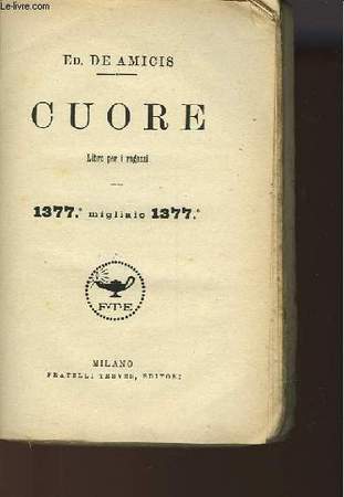 Très belle édition populaire italienne imprimée sur beau papier couché du "Livre-cur", roman pour enfants de l'écrivain italien Edmondo De Amicis et paru en 1886. Il se présente comme le journal d'un écolier italien au cours de l'année scolaire 1881-1882.L'ouvrage est illustré en noir de vignettes et hors-textes de A Ferraguti, E. Nardi et A. G. Sartorio, couverture vignette en page de titre et frontispice imprimés en bistre.Cachet de la signature de Amicis au verso de la page de titre comme il se doit.Très bel ouvrage.