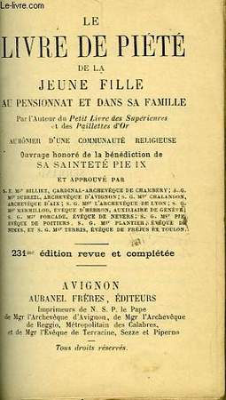 AUBANEL. 1872. In-16. Cartonné. Etat d'usage, Couv. défraîchie, Dos fané, Papier jauni. 847 pages. Présence de taches d'encre sur quelques pages n'altérant pas la lecture du texte. Tranches dorées. Dos à 4 nerfs. Dos cuir vert sapin.. . . . Classification Dewey : 200-RELIGION