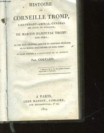MASSON. 1824. In-12. Cartonnage d'éditeurs. Bon état, 2ème plat abîmé, Dos abîmé, Intérieur bon état. 408 pages. Frontispice : Portrait en noir et blanc de Corneille Tromp. Tranche marbrée. Etiquette en deuxième de couverture.Couverture : fortes épidermures, petits manques sur les plats. Dos : fleurons titre, autueur, roulettes en doré, fortes épidermures, manques importants.. . . . Classification Dewey : 840.08-XIX ème siècle