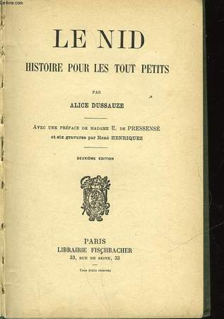 LIBRAIRIE FISCHBACHER - 2° EDITION. non daté. In-8. Cartonnage d'éditeurs. Etat d'usage, 1er plat abîmé, Dos abîmé, Déchirures. 122 pages. Quelques grauvures illustrées en noir et blanc hors texte. Quelques culs-de-lampe. Couverture toile verte illustrée. Coins du premier plat frotté. Dos : coiffe en-tête abîmée, coiffe en-pied abîmée.. . . . Classification Dewey : 840.091-XX ème siècle