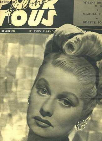 25 juin 1946, Films pour tous, in-folio de 16 pages, couverture illustrée d'une photographie noir et blanc de Lucile Ball sur le 1er plat et de Betty Hutton sur le 4eme plat, nombreuses photographies noir et blanc. « Le plus grand journal du cinéma », avec Viviane Romance, Marcel Carné, Odette Joyeux. | Etat : Bon état général, défraîchi, dos et coins frottés (Ref.: G4772)