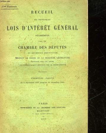 IM. DE LA CHAMBRE DES DEPUTES. 1921. In-8. Broché. Etat d'usage, 1er plat abîmé, Dos satisfaisant, Intérieur frais. 408 pages. Petites rousseurs sur la couverture.. . . . Classification Dewey : 340-Droit