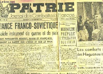PATRIE. 1945. In-12. Broché. Etat d'usage, Couv. convenable, Dos satisfaisant, Intérieur acceptable. Environ 4 pages par numéros. Nombreuses photos en noir et blanc dans le texte. Ecritures au stylo rouge de la date en première de couverture. Manque important sur le N°26, altérant la lecture.. . . . Classification Dewey : 70.1-Journaux