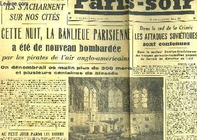 PARIS SOIR. 1940 - 1944. In-Folio. En feuillets. Bon état, Couv. convenable, Dos satisfaisant, Intérieur frais. Environ 4 pages par numéros. Nombreuses photos en noir et blanc dans le texte. Ecritures au stylo sur la première page.. . . . Classification Dewey : 70.1-Journaux
