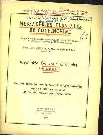 Assemblée Générale Ordinaire du 5 juin 1952, Rapport présenté par le conseil d'aministration, rapports du commissaire, résolutions votées par l'assemblée. Classification Dewey : 330-Economie