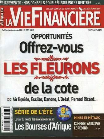 L'hebdo conseil de votre argent, chaque vendredi. Sommaire : Offrez-vous les fleurons de la cote ; Mines : comment anticiper le rebond ; Thales : un acteur mondial de la défense : Atos Origin : Un Bonus capé pour un champion des Jeux ; Assurance vie : incidences de l'exonration du conjoint ; Nîmes : habiter sur une colline ; Fauvisme ;les Hongrois sortent leurs griffes. Classification Dewey : 330-Economie