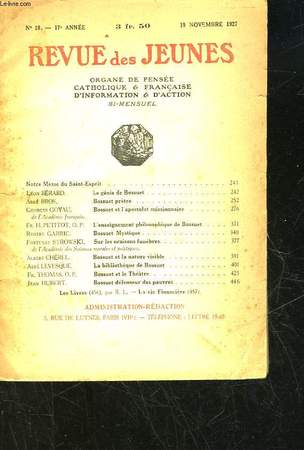 Organe de pensée catholique et française d'information et d'action, bi-mensuel. Sommaire : le génie de bossuet, Bossuet prêtre, bosuet et l'apostolat missionnaire, l'enseignement philosophique de Bossuet, Bossuet Mystique, Sur les oraisons funèbres, Bossuet et la ntature visible, la bibliothèque de Bossuet... Classification Dewey : 200-RELIGION