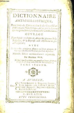 Avignon Aux dépens de la Société 1771 in 8 (19,5x12) 1 volume reliure pleine basane fauve époque, dos lisse très orné, pièce de titre et de tomaison de cuir beige, tranches teintées rouge, XXXII et 288 pages. Pour servir de Commentaire & de Correctif au Dictionnaire Philosophique, & aux autres Livres qui ont paru de nos jours contre le Christianisme. Ouvrage dans lequel on donne en abrégé les preuves de la Religion, & la Réponse aux objections de ses adversaires, avec la notice des principaux Auteurs qui l'ont attaquée, & l'apologie des Grands Hommes qui l'ont défendue. Louis-Mayeul Chaudon, 1757-1817. Tome 1 seul (sur 2). Bel exemplaire ( Photographies sur demande / We can send pictures of this book on simple request )
