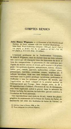 Comptes rendus : John Henry Wigmore, Axel Hagerstrom, Emile Chénon, G. Duponot-Ferrier, Sir paul Vinogradoff, Willima Kurtz Gotwald, Luigi La Vaccara, Louis Selosse, Extrait de la nouvelle revue historique de droit Français et étranger, 4° série 8° année. Publiée sous la direction de MM. J. Tardif, M. Prou, P. Dareste, P. F. Girard, P. Fournier, B. Haussoullier, Roger Grand et E. Perrot. Classification Dewey : 340-Droit