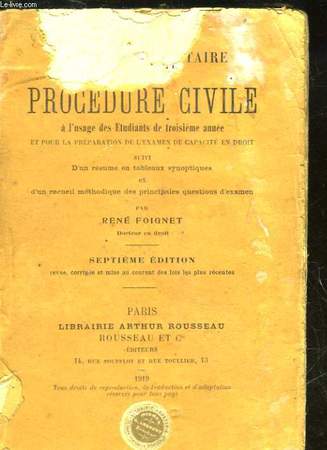 "LIBRAIRIE ARTHUR ROUSSEAU - 7° EDITION. 1919. In-12. Broché. Etat passable, Plats abîmés, Dos abîmé, Intérieur acceptable. 404 + 24 pages dépliantes ""Procédure civile, résumé en tableaux synoptique"". Manque sur les premières pages, sur le premier plat et le dos. Manque la moitié du second plat.. . . . Classification Dewey : 346-Droit privé, civil"