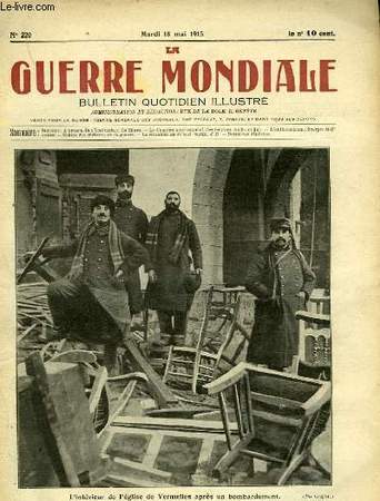"Sommaire : Sur mer : a propos de ""Lusitania, le silence ; Le congrès international des femmes (sutie et fin) ; l'enthousiasme, Georges Hoffmann ; Cartes des théâtres de la guerre ; La situation au 18 mai matin, J.D. ; Dernières dépêches. L'intérieur de l'église de Vermelle après un borbardement. Classification Dewey : 940.3-Première Guerre mondiale 1914-1918"