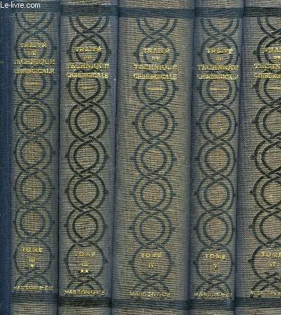 Masson et cie 1944 in8. 1944. Reliure editeur. abondante iconographie en noir et blanc sous forme de dessins descriptifs des gestes chirurgicaux. ce lot comprend 6 tome en 7 volumes: Tome I: généralités chirurgies des tissus et chirurgie des membres par Oberlin. Tome II: tête et coup rachis par Truffert et Oberlin Tome III (en 2 vol.): Thorax mamelle organes génitaux de la femme opérations césariennes par Mocquot Tome IV: Abdomen: parois et tube digestif par QUénu TomeV: abdomen: foie pancréas rate épiploon mésentère vaisseaux et nerfs laparotomies urgentes incisions des abcès par Quénu Tome VI: chirurgie de l'appareil urinaire et de l'appareil génital de l'homme par Fey et Dossot