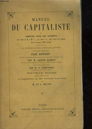 Nouvelle édition augmentée d'une notice sur l'intérêt, l'escompte, etc..., par M. joseph Garnier. revue pour les calculs par M. X. Rymkiewicz.Paris, 1859, Librairie de Garnier Frères, in 8°, 1/2 rel. basane verte, 459 pp.exemplaire usagé.