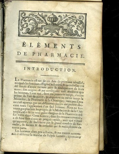 Contenant toutes les opérations fondamentales de cet art, avec leur définition, et une explication de ces opérations par les principes de la chimie.La manière de bien choisir, préparer et mêler les médicaments, avec des remarques et des réflexions sur chaque procédé.Les moyens de reconnoitre les médicaments falsifiés ou altérés.Les recettes des médicaments nouvellement mis en usage.L'exposition des vertus et doses des médicaments.Les principes fondamentaux de plusieurs arts dépendants de la pharmacie, tels que ceux du confiseur, et ceux de la préparation des eaux de senteur et des liqueurs de table.Avec l'exposition des vertus et doses des médicaments à la suite de chaque article.Par Antoine Baumé. Cinquième édition, revue, corrigée et augmentée.A Paris, chez Samson, libraire - 1784 - xxxix. 884 pages. Complet des 3 planches et du tableau dépliant.Reliure plein veau de l'époque. Dos à nerfs orné et doré avec pièces de titre. Coiffes usées. 2 coins émoussés. Tranches marbrées. Menus frottements sur les plats. Pas de rousseur. Assez bon état. Format in-8°(20x12).Antoine Baumé est un pharmacien et chimiste français (1728-1804). Dans l'édition de 1795 de ses éléments de pharmacie théorique et pratique, il tente de démontrer que l'eau n'est pas composée d'hydrogène et d'oxygène en réfutant les expériences de Lavoisier et Laplace.