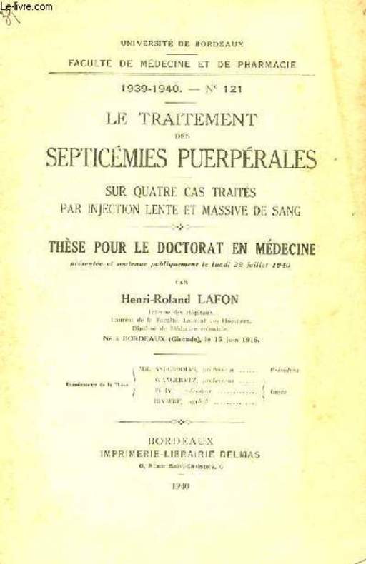 IMP.-LIBRAIRIE DELMAS. 1940. In-8. Broché. Etat d'usage, Couv. légèrement passée, Dos satisfaisant, Intérieur frais. 54 pages. Annotations en page de garde. 1939-1940.. . . . Classification Dewey : 610-Sciences médicales. Médecine