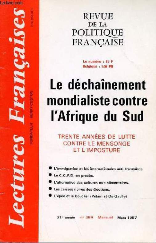 Sommaire : L'immigration et les internationales anti-françaises. Le C. C. F. D. en procès. L'alternative des cultures non alimentaires. Les caisses noires des élections. L'épée et le bouclier (Pétain et De Gaulle). Classification Dewey : 70-Journalisme, édition. Journaux