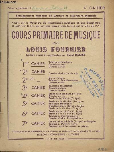E. Gallet. Non daté. In-8. Broché. Etat d'usage, Couv. légèrement passée, Agrafes rouillées, Intérieur acceptable. 24 pages agrafées de partitions et d'exercices, dont certains déjà réalisés à l'encre et au crayon de papier. 2 tampons sur le 1er plat. Non daté.. . . . Classification Dewey : 780-Musique